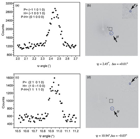 Intensity of a weak reflection as a function of the azimuthal angle. At the peak, the main contributing simultaneous reflection is (a) H = ( 1 0 1 0) and (c) H = (1 0 0 0). The relative positions of the involved reflections at the peak are shown by CCD images right to them, (b,d), respectively.