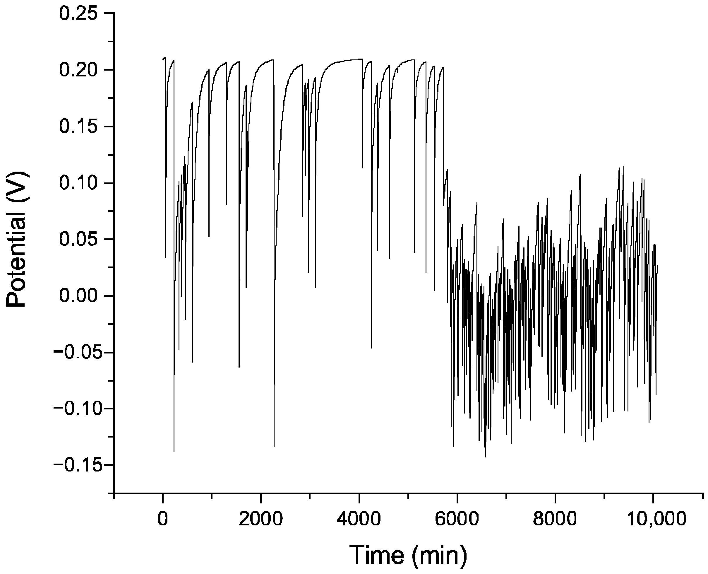 Figure 3, the graph depicts the corrosion potential during the 7-day analysis of the three concentric octo-donut pattern LST on AISI 430 stainless steel: 300 mm/s speed and 30 kHz frequency, one repetition. The current range was from 1 μA to 1 mA with the range from 10 mV to 1 V for the potential range, with 30 min as time for stabilization.