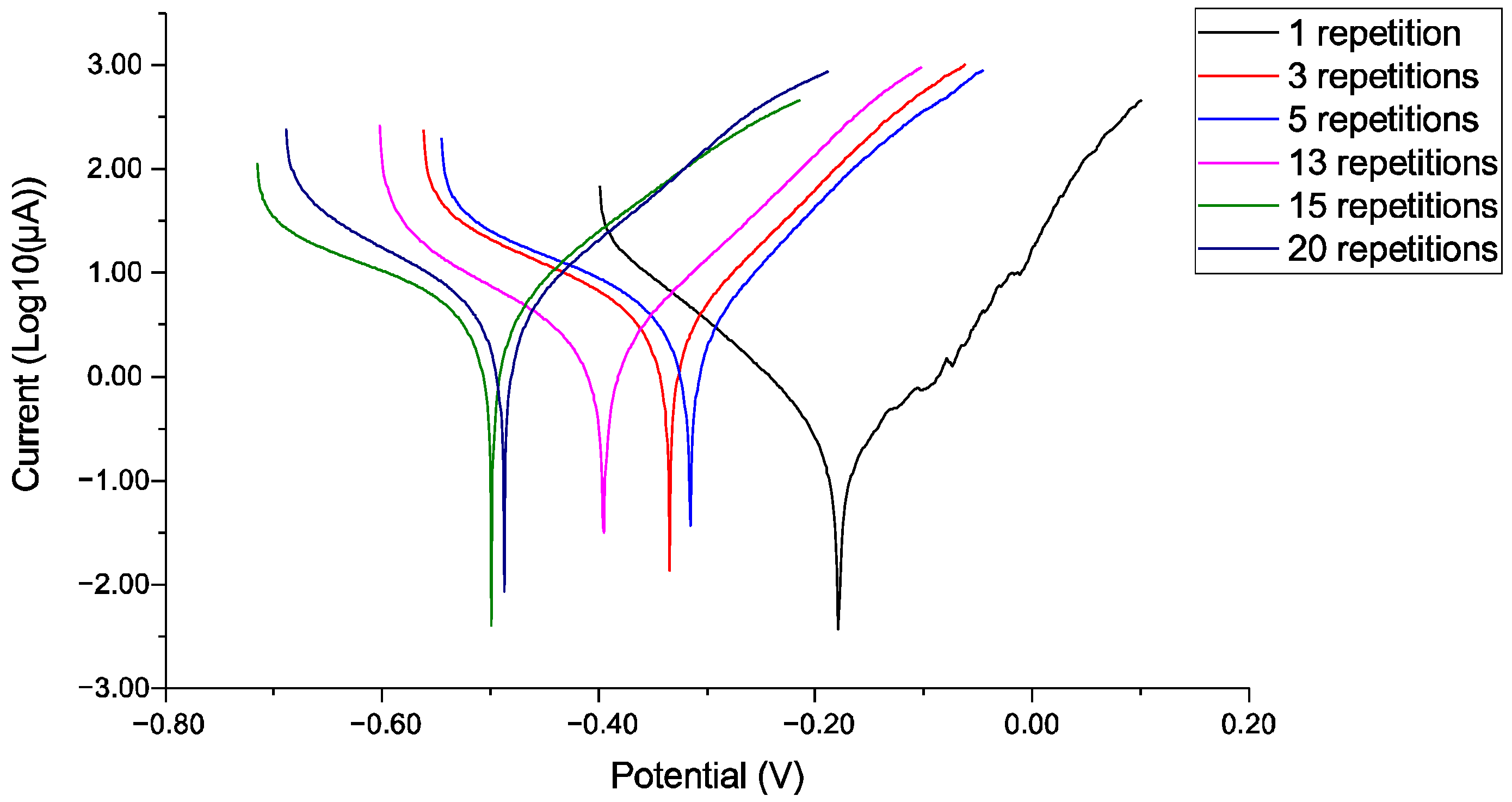 Table 2 provides critical insights into the changing corrosion mechanism. The sample with a single repetition shows an anomalously high anodic Tafel slope (β