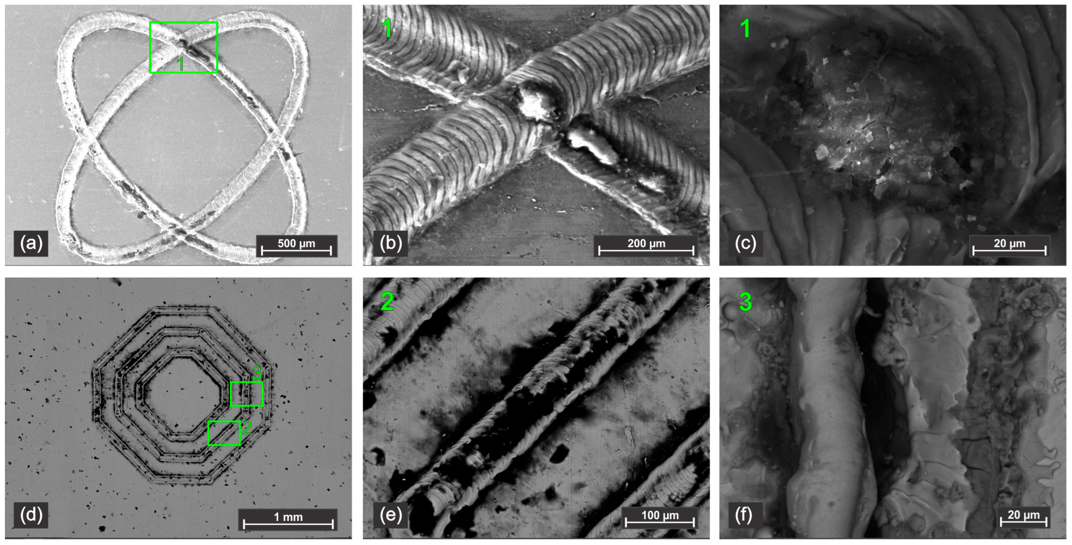 Figure 9d–f of the concentric octo-donuts, the expulsion of Cr and C from the contour of the laser tracks on the elevation of the recast material is noted.