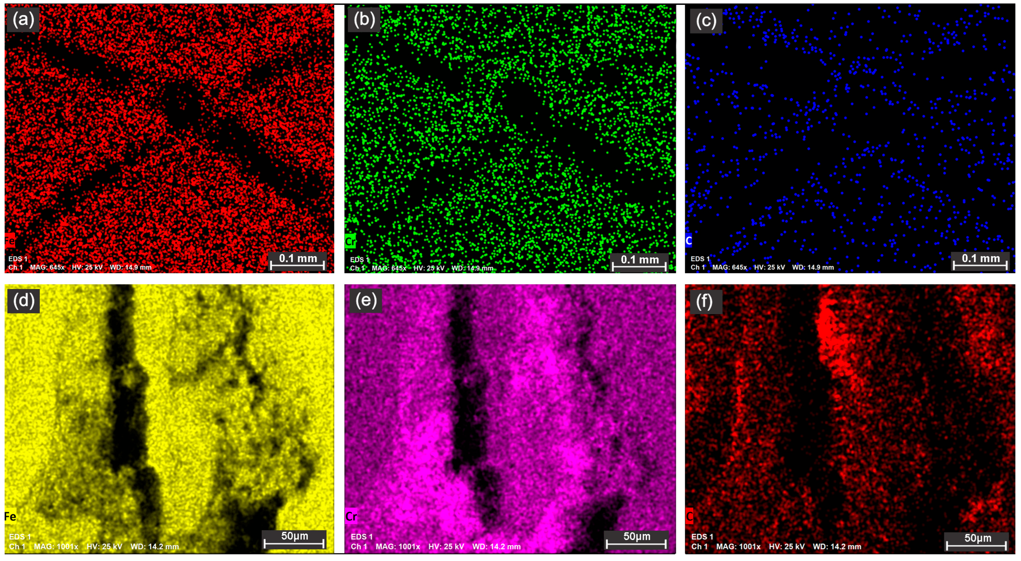 Figure 9a–c of the 90° overlapped ellipses, the reduction in Fe, Cr, and C content can be observed on the contour of the laser tracks, except for the intersection area of the two traces, where the content of the analyzed elements increases. In