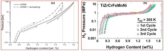 - Kunce, I.; Polanski, M.; Bystrzycki, J. Microstructure and Hydrogen Storage Properties of a TiZrNbMoV High Entropy Alloy Synthesized Using Laser Engineered Net Shaping (LENS). Int. J. Hydrogen Energy 2014, 39, 9904–9910. [Google Scholar] [CrossRef]
