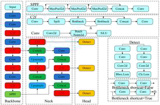 YOLOv8 is an advanced target detection algorithm that has undergone multiple optimizations and improvements based on the framework of YOLOv5 and YOLOv7. The algorithm structure is shown in Figure 1 and is mainly divided into four modules: Input, Backbone, Neck and Head. Input uses Mosaic data enhancement technology, adaptive image scaling, and grayscale filling strategies for pre-processing images to enhance the model’s generalization ability. The backbone network replaces the C3 module with the C2f module based on the ELAN idea of YOLOv7, which has richer gradient flow information and reduces the number of convolutional layers before upsampling. It makes the network model more lightweight. The neck network continues to use the feature pyramid (FPN) and path aggregation structure (PAN) structures. The head network uses a decoupled head structure in Decoupled-Head for different classification and detection tasks [23]. The CIOU+VFL combination is used as the loss function in regression.