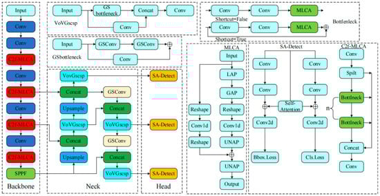 To enhance the network model’s feature extraction ability and meet the needs of detection accuracy and real-time requirements. First, the MLCA (Mixed local channel attention) [24] structure is applied in the C2f module of the backbone network, which can better integrate local, global, spatial, and channel information. The number of model parameters and the amount of computation can be reduced. Secondly, the GSConv and VoVGscsp modules [25] are used in the neck network, which have lightweight and cross-layer feature information fusion capabilities. In the detection head part, the SA (self-attention) mechanism [26] is applied to improve the feature information separation ability in the output stage and enhance the detection ability for small targets. The YOLOv8-MGVS model structure is shown in Figure 2.