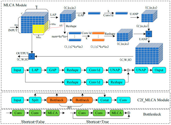 In the backbone network of YOLOv8, the C2f module works in concert with other modules such as the Conv module and Bottleneck to complete the feature extraction task. However, due to the limited local receptive field of the C2f module, it fails to capture sufficient features in cases of image occlusion which leads to the loss of feature information and aliasing. Additionally, the complexity of the steel surface background increases the computational intricacies of the C2f module in the deep network structure, which affects the operation efficiency and speed of the model. To improve the network expression ability and reduce the number and complexity of model parameters, a lightweight C2f-MLCA module is designed. The C2f-MLCA model structure is shown in Figure 3.