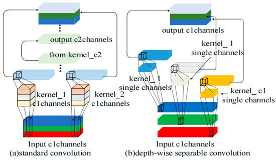 Standard convolution (SConv) is a channel-dense computation. Multi-channel convolutional kernels are used to process multi-channel images, and the output feature map has both channel features and spatial characteristics. Depthwise separable convolution (DWConv) is a channel-sparse computation, which is divided into Depthwise convolution and Pointwise convolution [27]. Depthwise convolution applies convolution kernels to each input channel independently, which can significantly reduce the number of parameters and computational volume. Pointwise convolution combines features from different channels to enhance the model’s expressive ability, as shown in Figure 4. Their complexities are as follows: