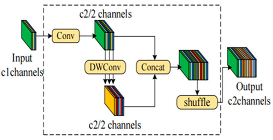 The GSConv module is a lightweight convolution module that uses DWConv. In traditional convolutional neural networks (CNNs), the input image undergoes a series of transformations that gradually transfer spatial information to channels. However, each time the spatial size (width and height) of the feature map decreases and the number of channels increases, some semantic information may be lost. First, GSConv operates on the input feature maps. The generating feature map channels are half the number of input channels. Then, the feature maps are processed through depthwise separable convolution (DWConv) and concatenated with the original feature maps. Finally, concatenated maps (shuffle) are randomly permuted and then form new feature channels, which can improve the flow of information between features. Computational complexity is reduced while improving computational accuracy, as shown in Figure 5.