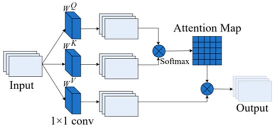 SA (self-attention) operates through three 1 × 1 convolutions for query, key, and value operations (Figure 7). The dot product of the query vector and the key vector are calculated to obtain the attention matrix. Then, it is normalized through the softmax function to obtain attention weights for each position. Finally, the value vector and the attention weight are weighted and summed to obtain the final attention output. For the input features , query, key, and value are calculated through three different weight matrices: