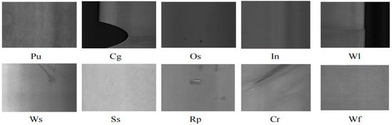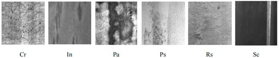 The datasets used in this paper are the Northeast University steel surface defect dataset (NEU DET) and GC10-DET Metallic Surface Defect Datasets (GC10-DET). The NEU DET (Figure 9) includes six types of defects: Crazing (Cr), Inclusion (In), Patches (Pa), Pitted surface (Ps), Rolled-in scale (Rs), and Scratches (Sc). Each category has 300 images, with a total of 1800 images, which are divided into training sets, test sets, and validation sets according to 8:1:1.