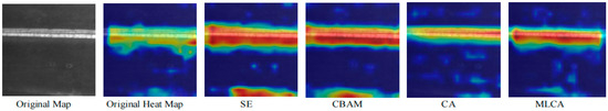 The MLCA mechanism is effective in the C2f module of the backbone network compared with other attention mechanisms. Three different attention mechanisms, SE [28], CBAM [29], and CA [30], were embedded in the same position for the attention mechanism experiments. The visual heat maps are generated in Figure 10.
