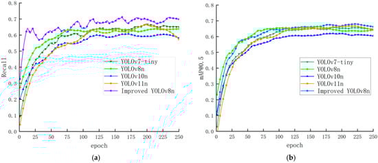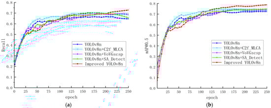 The effects of various improved methods on the YOLOv8n network model are verified through ablation experiments. The results are shown in Table 2, where “√” represents the addition of this module. And the recall curve and average accuracy curve are shown in Figure 11.