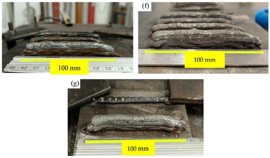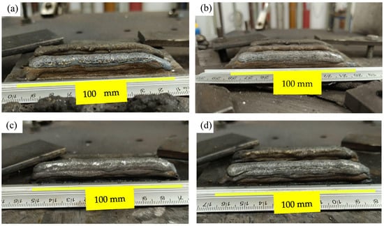The walls contaminated with oil (Figure 2c,d) exhibited reductions in width towards the end of their length. Additionally, the walls contaminated with chalk (W2 and W3) showed excessive surface oxidation in the layers where the contaminant was introduced, significantly compromising arc stability when evaluated layer by layer, as also discussed by Bevans et al. [31]. As a preliminary assessment in the context of investigating defects and arc stability in walls manufactured by WAAM from 316L-Si stainless steel, visual inspection was complemented by quantitative and experimental indicators, as shown in the following sections.