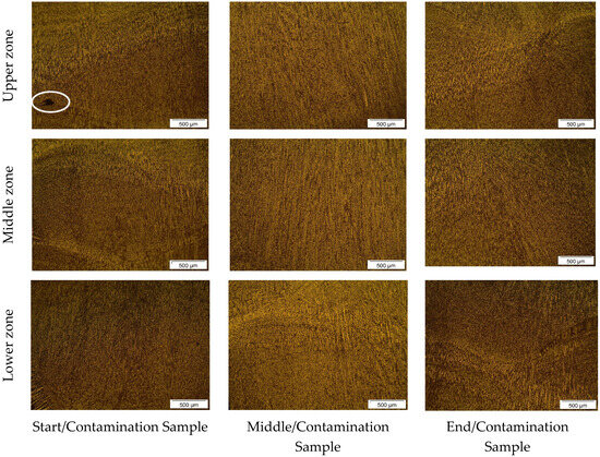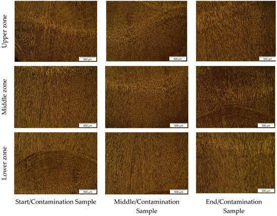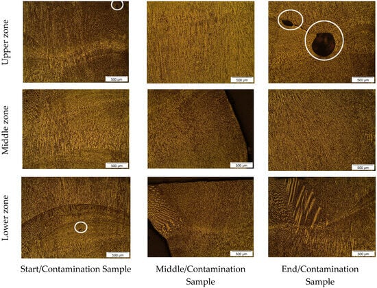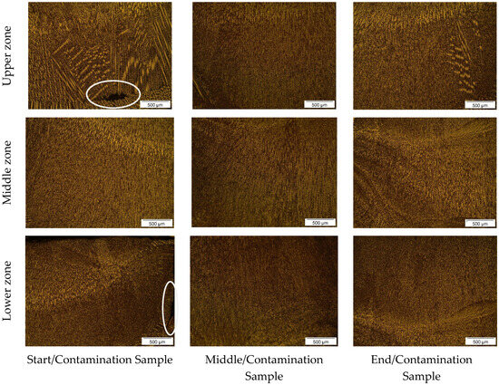 Figure 6 shows similar behavior in the microstructural characteristics of the oil-contaminated samples, as previously analyzed in Figure 5. In both the upper and lower zones, the initial/contaminated and end/contaminated samples exhibited irregular solidification patterns, deviating from the typical WAAM process characteristics. This suggests that the presence of oil during deposition caused irregular metal solidification due to gas generation. In contrast, the upper and lower zones of the medium/contaminated sample reveal a more homogeneous microstructure with a finer grain size, which could be attributed to the lower influence of oil in this part of the deposit or to the imprecision in sampling from the wall.