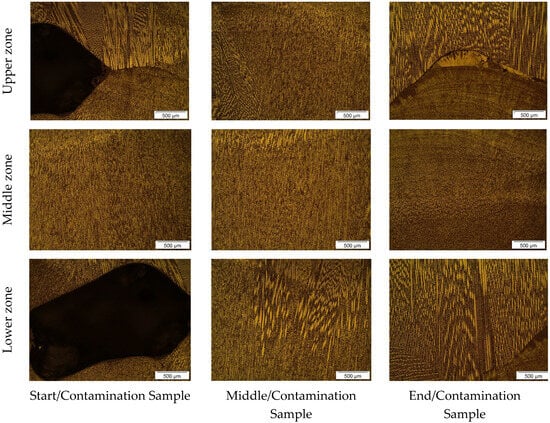 From Figure 3, the microstructure of the W2 sample can be observed. In the analysis of Figure 3, regarding the upper zone, the start/contamination sample showed a relatively homogeneous microstructure with a darker region prominently highlighted, possibly related to the accumulation of chalk during deposition. In this region, the middle/contamination sample also showed a relatively homogeneous microstructure with elongated grains in the direction of solidification. The end/contamination sample exhibited a more evenly distributed microstructure, but with a highlighted area of material accumulation resulting from the buildup of chalk in that location.