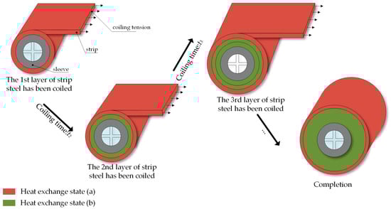 The process of coiling is simplified into thin-walled cylinders nested layer by layer on a thick-walled cylinder. The surface of the coil is covered by a layer of high-temperature strip and forms a new coil. After a period of heat exchange, the new coil is covered by a new layer of high-temperature strip to exchange heat. This process is repeated until the end of coiling, and the heat transfer state of each layer is different and changes in real time during the process. According to the radial heat transfer state, the strips can be divided into two categories: (a) The inner side of the strip is in the contact heat conduction state, while the outer side is in the heat dissipation state exposed to the air; (b) Both the inner and outer sides of the strip are in the contact heat conduction state. The temperature field model is shown in Figure 1. When coiling the (n + 1) layer, the n-th layer is in the heat exchange state (a) and the other layers are in state (b). The duration is the time required to coil the (n + 1) layer. After the coil is covered by the (n + 1) layer, the (n + 1) layer is in state (a) and other layers are in state (b). The duration is the time required to coil the (n + 2) layer. By repeating this process, the temperature distribution at any time during the coiling process can be calculated based on the heat exchange state and time of each layer.