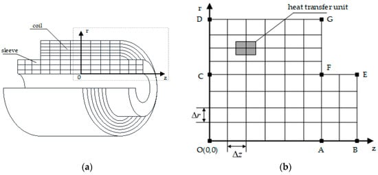 Both the coil and the sleeve can be regarded as axisymmetric thick-walled cylinders, and the thermal conductivity differential equations can be presented as Equation (1).