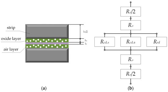 The radial layered structure can be regarded as a continuous superposition of thermal conduction units, as indicated by the shaded areas in Figure 2. The thermal conduction unit is composed of the strip itself, the oxide layer, and the air layer at the contact interface. The thermal resistance of the thermal conduction unit can be presented as Equation (2). The composition of the thermal conduction unit is shown in Figure 3a.