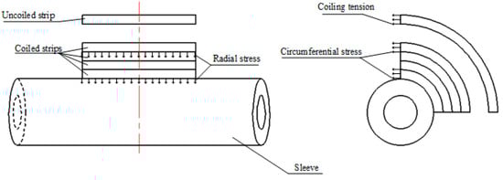 where and are radial stress and circumferential stress of the i-th layer and coiling tension. is the number of coiled layers; and are the radius of the i-th layer and the radius of the coiled layers; is the contact pressure of the innermost layer when the t-th layer strip has been rolled, which can be obtained from the elastic deformation of the sleeve.