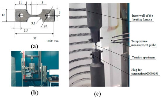 In order to study the effect of temperature on the elastic modulus of a strip, samples are collected from the site and tensile tests are conducted at the temperature nodes of room temperature, 150 °C, 250 °C, 350 °C, 450 °C, 550 °C, and 650 °C. Figure 5a shows the dimensions of the specimen, and the edges of the specimen are polished. In Figure 5b, the testing machine model is Zwick 150 kN. Figure 5c shows the specimen clamping inside the heating furnace. The temperature inside the heating furnace is raised to the temperature node and held for 60 s. Then, the tensile test is repeated three times at each temperature node and the deformation of the specimen is recorded with an extensometer.