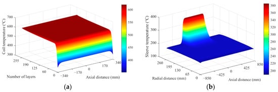 (a) Temperature distribution of circumferential section of the coil; (b) Temperature distribution of circumferential section of the sleeve.