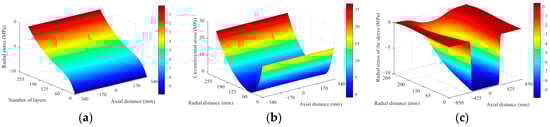 (a) Radial stress of the coil; (b) Circumferential stress of the coil; (c) Radial stress of the sleeve.