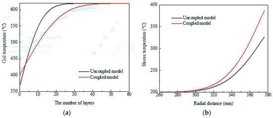 As shown in Figure 9a, the temperature of the coupled model is relatively high near the contact surface. As the radius increases, both results gradually approach the coiling temperature, but the temperature of the coupled model is smaller. The difference is largest around the 15th layer, about 60 °C. The reason is that the radial stress in the coupled model is relatively high, which increases the radial thermal conductivity. Within the same coiling time, more heat flows from the coil to the sleeve, resulting in a decrease in temperature of the coil. In Figure 9b, compared with the uncoupled model, the surface temperature rise of the sleeve in the coupled model is larger and the temperature difference is about 50 °C.
