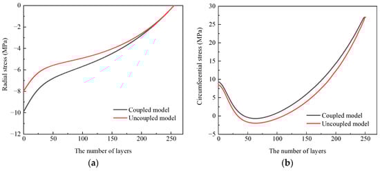(a) Radial stress of the coil in coupled model and uncoupled model; (b) Circumferential stress of the coil in coupled model and uncoupled model.