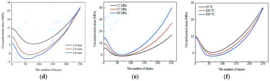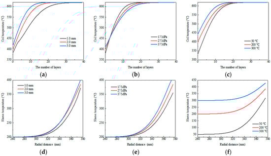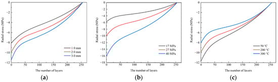 The temperature and stress fields of the coil are affected by the coiling process parameters. Therefore, in this article, the thickness of the strip, the coiling tension, and the initial temperature of the sleeve are taken as variables to study the temperature and stress fields. Figure 11 shows the calculation results of stress. It can be seen that as the thickness of the strip and the coiling tension increase, and as the initial temperature of the sleeve decreases, the radial stress inside the steel increases. This is because the increase in thickness of the strip and coiling tension both lead to an increase in the total tensile force of the circumferential section, resulting in an increase in the radial stress increment. By reducing the initial temperature of the sleeve, the difference in elastic modulus between the coil and the sleeve is increased. It is more difficult to deform for the sleeve, and the reduction in radial displacement of the coil can lead to an increase in radial stress. In the case of the same radius, the circumferential stress corresponds to the slope of the radial stress curve. This rule is reflected in Figure 11d,f. However, since the horizontal axis represents the number of layers rather than the radius, the rule is not applicable in Figure 11b.