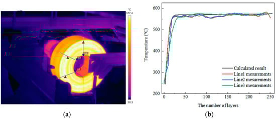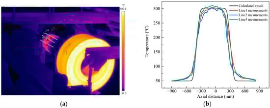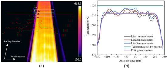 In actual production, due to the direct exposure to air, the temperature of the strip before coiling will be lower than the temperature set by the process and there will be a certain temperature drop at the edges of the strip. Therefore, in this article, the temperature before coiling on the hot-rolling line is measured and the measurement results are fitted. The temperature field is calculated based on the fitting results and compared with measurements on site to verify the correctness of the model. The initial temperature of the sleeve is set to 50 °C, and the other conditions are the same as the parameters in Table 4. Figure 13 shows the temperature distribution of the strip before coiling. The surface temperature of the strip is directly captured by a thermal imaging system, and the model is FLIR-E95.
