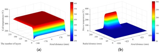During the dynamic coiling process, because of the mutual influence of temperature and stress, the time increment step is reduced and the temperature field and stress field are coupled in the calculation. For the convenience of observing temperature differences, Figure 9 shows the temperature distribution on the axial symmetry plane (OD section in Figure 2). For the coil, the layer range is from 0 to 60 layers, while for the sleeve, the radius range is from R = 260 mm to R = 376 mm.