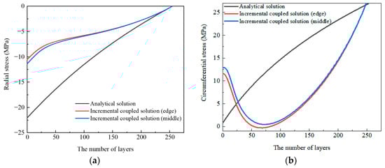 (a) Comparison of incremental coupled solution and analytical solution in radial stress; (b) Comparison of incremental coupled solution and analytical solution in circumferential stress.