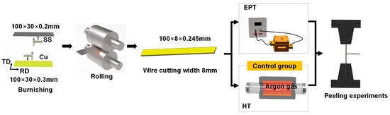 The preparation and post-treatment processes of the Cu/SS composite thin strips are depicted in Figure 1. Prior to assembly, the oxide layer and contaminants on the bonding surfaces were removed using a steel wire brush. The SS strip (upper layer) and Cu strip (lower layer) were then stacked and fed into a ZJ150 two-high rolling mill (XFRMM Ltd., Shenyang, China). To achieve a 50% reduction rate in the Cu/SS composite thin strip, the rolling force was set to 90 kN. The rolled Cu/SS composite strip was subsequently cut into 8 mm-wide strips using wire electrical discharge machining. These strips served as specimens for electric pulse treatment (EPT), while two additional groups underwent corresponding heat treatments (HTs) as control groups. During the EPT process, thermocouples connected to a temperature recorder with the model TCP-500XL (MEASURE FINE Ltd., Hangzhou, China) were placed in contact with the SS strip to monitor the temperature of the Cu/SS composite thin strips. Finally, peeling tests were performed to evaluate the bonding strength under varying parameters.