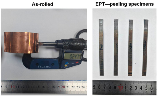 The Cu/SS composite thin strips after rolling and EPT are shown in Figure 2. To ensure an initial bonding strength after a single-pass rolling process, a high reduction rate was required to achieve preliminary bonding. The reduction rate was set at 50%, resulting in a post-rolling thickness of the composite thin strips ranging from 0.245 mm to 0.25 mm. The thickness of Cu is about 0.14 mm, and the thickness of SS is about 0.11 mm, and their reduction rates are 53.3% and 45%, respectively. Due to the mismatch in deformation behavior between pure Cu and SS, significant warping occurred in the composite thin strips after cold rolling. However, the application of EPT eliminated internal stresses, resulting in a flattened composite thin strip.