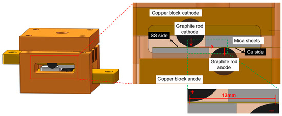 Based on our preliminary experiments, a fixture capable of providing stable current conduction for composite thin strips was designed. As shown in Figure 3, the fixture adopts a sequentially moving configuration with positive and negative electrodes, where the distance between the two electrodes is 12 mm. By moving the electrodes, the composite thin strip is continuously subjected to pulsed current. The positive electrode contacts the SS side, while the negative electrode contacts the Cu side. When the pulse power supply is activated, the higher electrical conductivity of copper compared to SS causes the current to flow from the positive electrode through the steel strip and then immediately to the copper side. Since the Cu and SS strips are preliminarily bonded by the first pass of cold rolling, a small portion of the current also flows through the bonding interface and the SS strip.