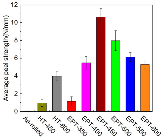 Average peel strength of the as-rolled, HT, and EPT specimens.