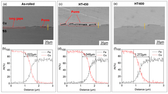 Figure 6 shows the SEM images and corresponding EDS line scan spectra of the Cu/SS composite thin strip in both as-rolled and HT states. Figure 6a,c,e, represent the composite interface states in the as-rolled and annealed conditions and the yellow line represents the line scan path, while Figure 6b,d,f show the diffusion thickness of Cu atoms towards the SS side. No plateau was observed in the EDS line scan spectra at the bonding interface of the samples, indicating that no intermetallic compounds (IMCs) were formed at the Cu/SS bonding interface [14]. As shown in Figure 6a,c,e, defects can be observed at the composite interface in both the as-rolled and HT conditions. From Figure 6a, it is evident that there are significant long gaps and pores at the composite interface (marked by red dashed boxes), indicating poor bonding in the as-rolled Cu/SS composite thin strip. From Figure 6b, it can be seen that the thickness of the diffusion layer is only 1.022 μm. From Figure 6c, it can be seen that an incomplete hardened layer exists at the composite interface, which was caused by the breakage of the SS hardened layer under the rolling force, damaging the Cu substrate surface. The rolling process caused fresh Cu to bond with the SS substrate, resulting in a mechanical bond at the interface. However, pores remain at the interface, suggesting that annealing at 450 °C did not significantly improve the bonding strength, and the diffusion layer thickness slightly increased to 1.046 μm (Figure 6d). As shown in Figure 6e, at 600 °C annealing, most of the pores are eliminated, and the bonding state improves. As shown in Figure 6f, the thickness of the diffusion layer increased to 1.272 μm.