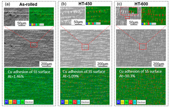 By observing the morphology of the peeled Cu/SS composite thin strips in both the as-rolled and HT states, EDS elemental analysis was performed on the Cu elements remaining on the SS surface after peeling. As shown in Figure 7a, the EDS scan reveals that the Cu remaining on the SS side in the as-rolled composite thin strip is insignificant, with a content of only 1.46%. As shown in Figure 7b,c, with the increase in annealing temperature, the diffusion area at the composite interface enlarges. After HT at 450 °C and 600 °C, the Cu content retained on the SS side slightly increases, reaching 5.09% and 10.30%, respectively. This Cu is mainly distributed in the cracks of the fractured hardened layer. A partial enlargement of Figure 7c (marked by red boxes), a small metallurgical bonding region can be observed, accompanied by the appearance of tiny ductile dimples, indicating that plastic fracture of the Cu substrate occurs in this area, and the bonding strength has been improved to some extent.