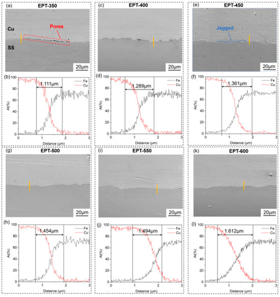 SEM image and EDS line scan (the yellow lines in the figure) of the Cu/SS interface after EPT: (a,b) EPT-350; (c,d) EPT-400; (e,f) EPT-450; (g,h) EPT-500; (i,j) EPT-550 and (k,l) EPT-600.