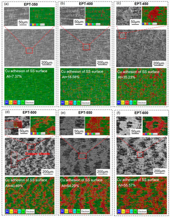 SEM images of the SS side and corresponding EDS surface scan spectra after EPT and peeling: (a) EPT-350; (b) EPT-400; (c) EPT-450; (d) EPT-500; (e) EPT-550 and (f) EPT-600.