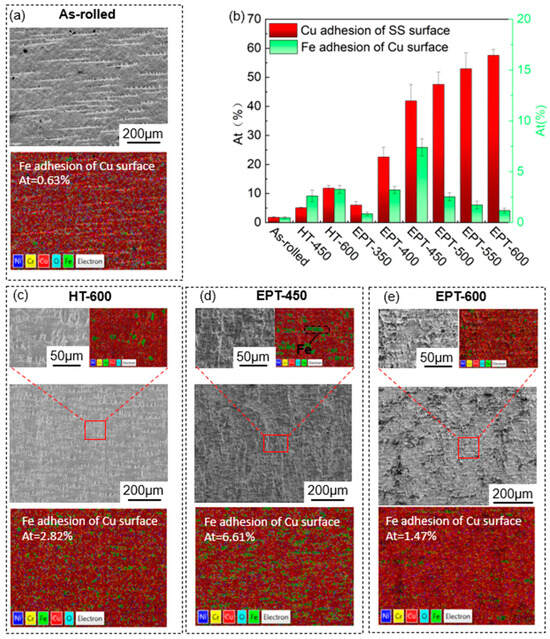 SEM images of Cu side, EDS scan, Cu content on SS side, and SS content on Cu side after peeling under different conditions: (a) as-rolled; (b) Cu and Fe content; (c) HT-600; (d) EPT-450 and (e) EPT-600.