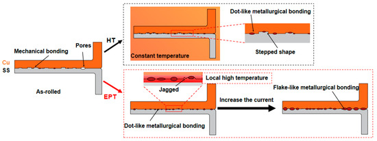 In the as-rolled state of the Cu/SS composite thin strip, the bonding interface contains many defects (long gaps and pores), and the resistivity at these defects is high. The high-energy drift electrons carried by the pulsed current interact extensively with the Fe/Cu atoms in the area, rapidly converting energy into heat and generating local high temperatures [29,30,31]. The pulsed current also induces periodic thermal expansion and contraction of the composite strip, which disrupts the brittle hardened layer at the bonding interface, causing it to melt. The electrical contacts must maintain good contact with the composite strip, thus applying a slight clamping pressure to the interface, making the bonding surface flatter [21,32].