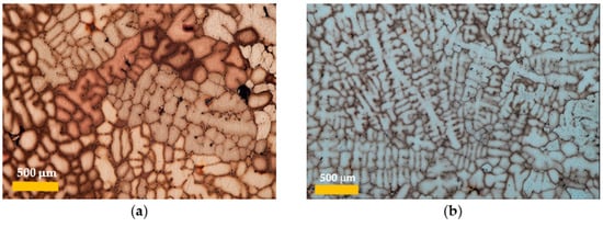 Using optical microscopy, copper grain sizes of commercial anodes and doped anodes were examined (Figure 1). A total of 500 Cu grains per anode were analyzed using NIS_Elements software v. 5.21.00 to determine the average grain size [34]. It was found that Cu grain sizes in the commercial anodes ranged from 100 to 150 μm, and grain sizes in doped anodes ranged from 90 to 130 μm. While Mitan [34] correlated decreasing grain size with increasing impurity concentrations in industrial copper anode samples, no correlation was found in this study.