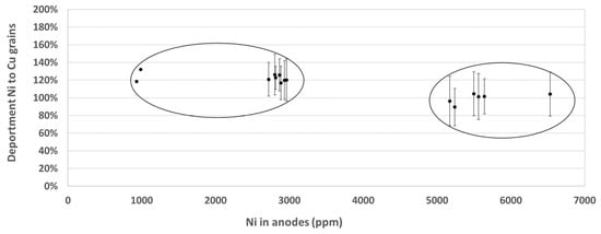 Figure 3 shows the ratio of the measured concentration of Ni in Cu grains by EPMA to measured bulk concentration of Ni in anodes by OES. When the nickel concentration is less than 3000 g/t (0.3 wt.%), the percentage of Ni found in the Cu grains is similar for the commercial anodes from Atlantic Copper and the doped anodes. For anodes that had Ni concentrations of 5000–6000 g/t, a reduction of ca. 20% in the deportment of Ni to the Cu grains was observed. Previous studies established that when Ni concentrations in anodes were above 2500–3000 g/t, NiO and Kupferglimmer were found along Cu grain boundaries [35,36]. Thus, the nickel not contained in the copper grains in this study are expected to be found in nickel-bearing inclusions like NiO and Kupferglimmer.