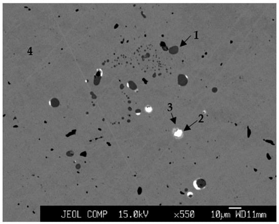 Backscattered electron micrograph showing the structure of the inclusions in doped anodes. 1–2—SnO2; 3–4—Kupferglimmer.