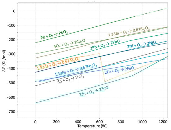 This can be explained due to the increase in impurities (e.g., Sn, As, Sb, Pb and Ni) with higher affinities for oxygen than Cu. These differences in oxide stability are shown in the Ellingham diagram presented in Figure 6. At the refining furnace temperature (ca. 1250 °C), oxide compounds with a lower ΔGf than the ΔGf for Cu2O are more likely to form. This resulted in a decrease in the amount of Cu2O formed as the anode solidified. The oxides formed are not dissolved in Cu grains, but form inclusions in the doped anodes. These new inclusions, which are not found in commercial anodes, corresponded to (i) SnO2, (ii) NiO and (iii) a complex Cu-Ni-Sb-Sn oxide called Kupferglimmer.