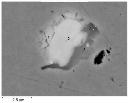 The selenide phase appears as grey rings in the backscatter SEM image, encircling partially both the complex oxide and the Cu2O oxide phases (Figure 4, point 3). The cross-section thickness of the ring structures was found to be typically 1–2 µm. Selenide phase compositions varied depending on the area analyzed. Cu ranged from 60 to 66 wt%, Se from 30 to 35 wt%, Ag from 0.1 to 0.5 wt% and Te from 3 to 4 wt%. Previous research had found that Ag substitutes for Cu, and Te for Se, forming (Cu, Ag)2(Se, Te) inclusions [28], which seems to be confirmed by this study. Se and Te are not expected to be detected in solid solution by EPMA, as the solubility of Se in copper at 500 °C is believed to be less than 3 g/t [40].