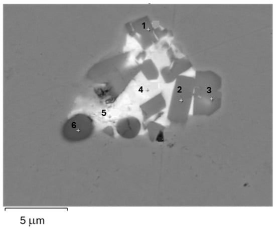 Backscattered electron micrograph showing the structure of the inclusions in doped anodes. 1–3—Kupferglimmer; 4–5—complex lead copper oxide; 6—NiO.