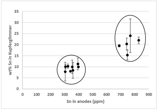 In the present study, Kupferglimmer was found to contain Sn (Figure 9). This happened for all anodes regardless of Sn content (300 to 800 g/t). The presence of Sn in Kupferglimmer was mentioned in previous studies [20,35], although the concentrations of Sn in the anodes were not reported.