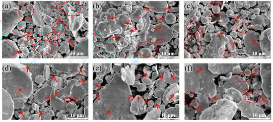 Figure 3 shows SEM images of VGCF/304L stainless steel composite powder with different ball milling times. As the ball milling time increases, the 304L stainless steel powder undergoes a repeated process of fracture, cold welding, and re-fracture due to constant violent impact, effectively refining the powder grain. After 16 h of ball milling, the stainless steel powder evolves from an initial approximately spherical or ellipsoidal shape to a layered morphology with a certain thickness. Increasing the ball milling time further does not significantly change the powder morphology. The red arrows and elliptical in the figure highlight the distribution of VGCF in the 304L stainless steel. With prolonged ball milling, VGCF gradually disperses evenly in the stainless steel powder matrix, mostly filling the matrix gaps, with a small amount adhering to the surface of the 304L stainless steel powder. Afterward, we calculated their average particle size (DAPS, μm) and listed the results in