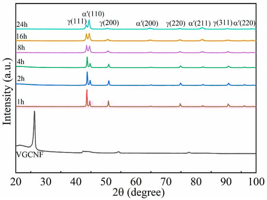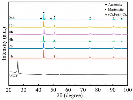 Figure 10 shows the XRD pattern of VGCF and VGCF/304L stainless steel SPS sintered bodies after different ball milling times at 50 MPa, 950 °C, and 10 min. As can be seen from the figure, the microstructure of the sintered material is mainly composed of the austenite phase and a small amount of the martensite phase. This is mainly because after adding VGCF, the carbon content in the composite material increases, causing the reverse martensitic transformation to be incomplete. Compared with the quenching heat -treatment process, the cooling rate of SPS is slower. Therefore, a small amount of (Cr,Fe)